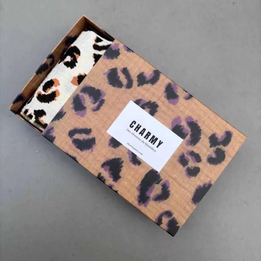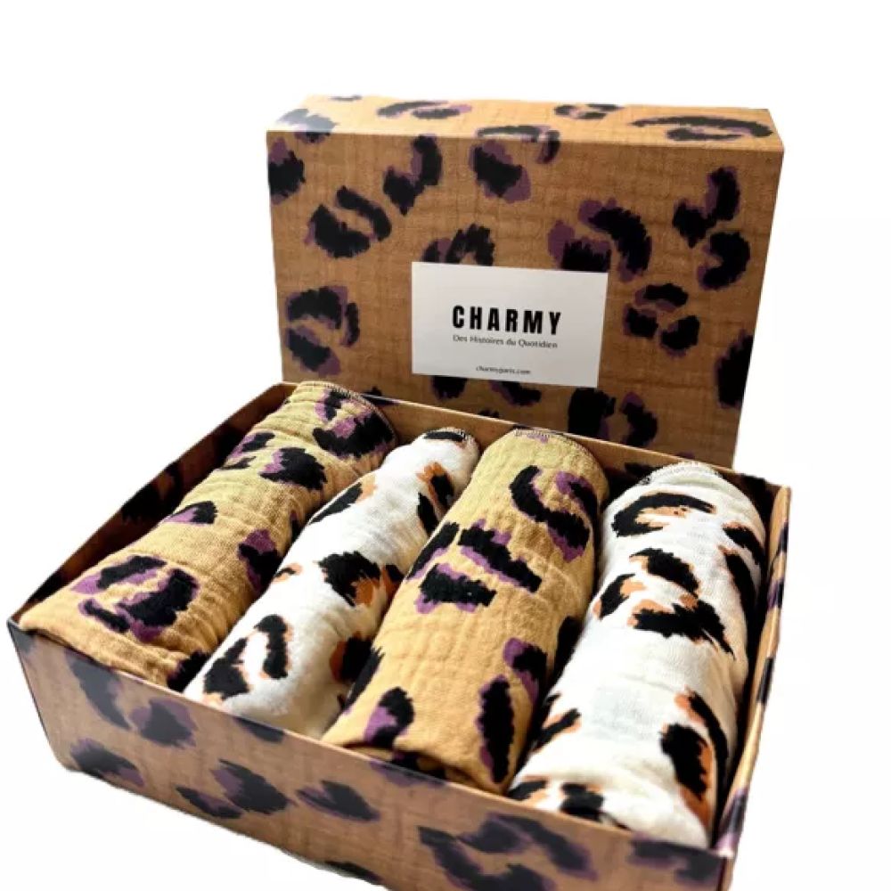 Set de 4 serviettes en gaze de coton motif léopard écru et fauve. Format 40×40 cm, finition point bourdon doré. Douces, légères et faciles à vivre : lavables en machine à 30°C, séchage rapide, pas besoin de repasser.