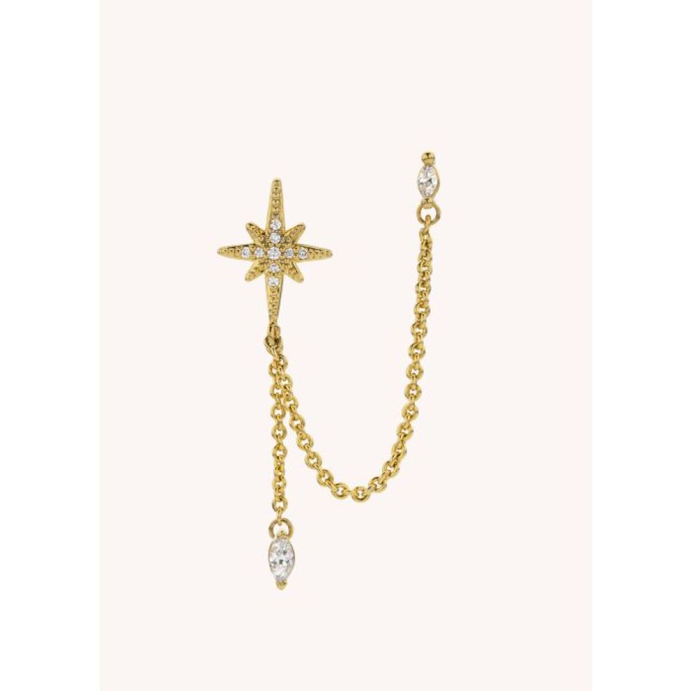 À porter à l’unité, elle relie deux trous d’oreilles avec finesse, entre étoile stylisée et trio de strass étincelants. C’est un bijou fort mais…