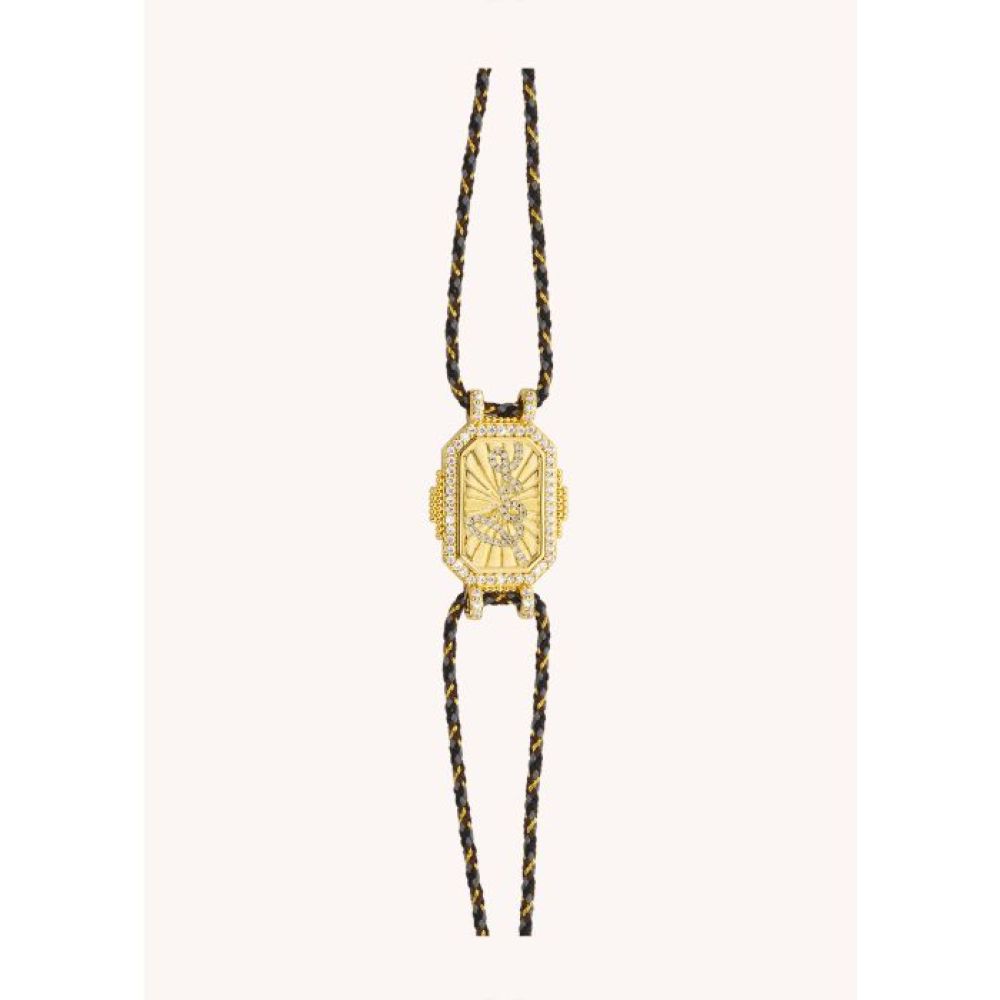 Son motif DIWALI, emblème lumineux de la maison, est posé comme une étoile sur une ligne d’or texturée. Le contraste entre le métal brossé et le cordon noir lui donne un look…