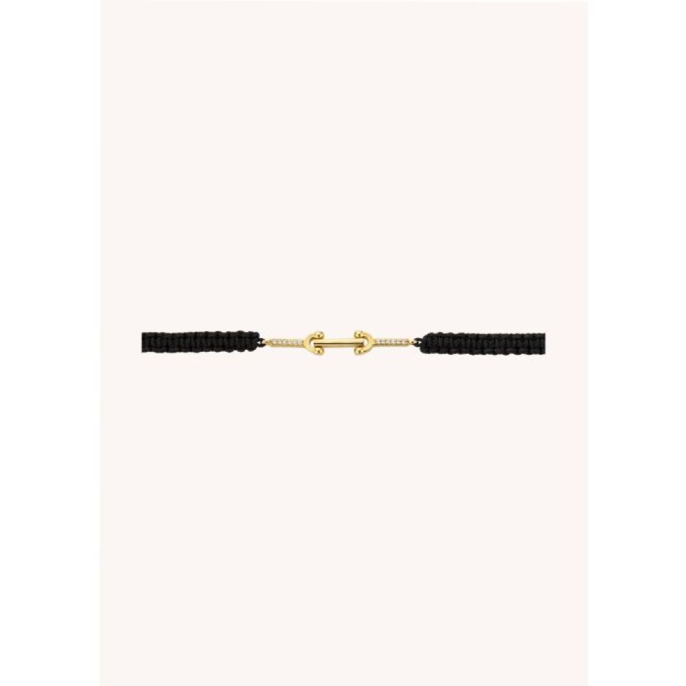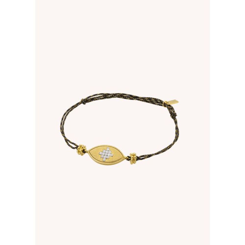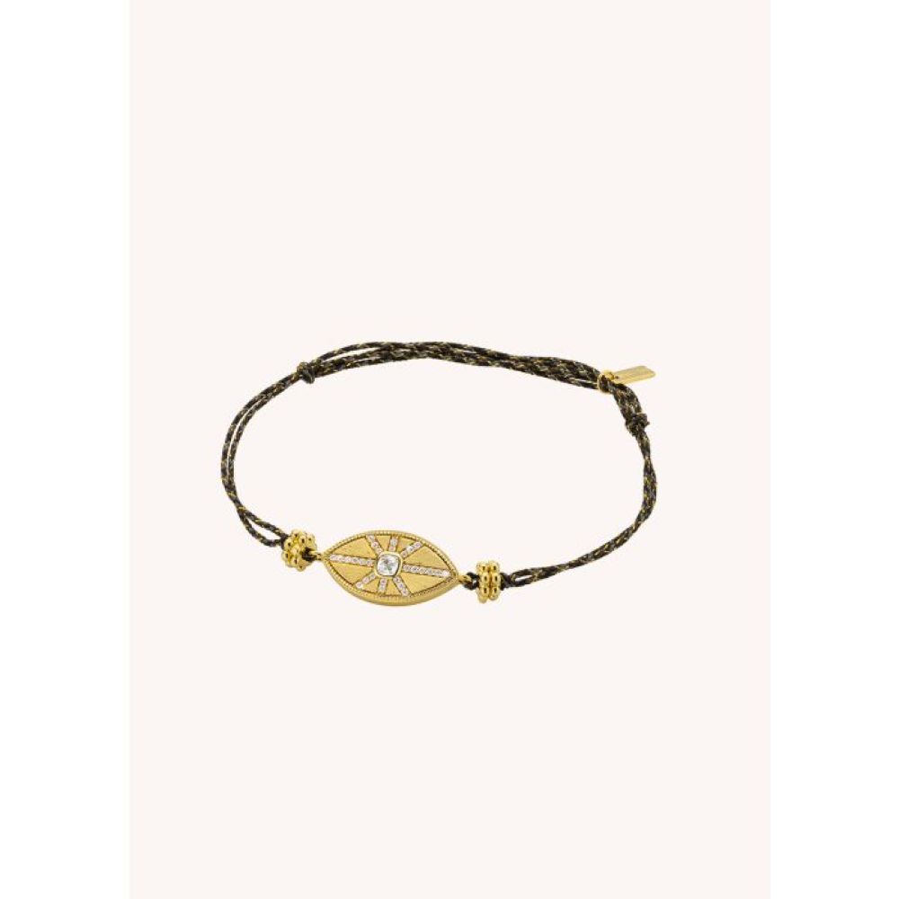 Le bracelet DIWALI LINK de MYA BAY, en or brossé et monté sur un cordon noir ajustable, mixe finesse et symbolique avec style.