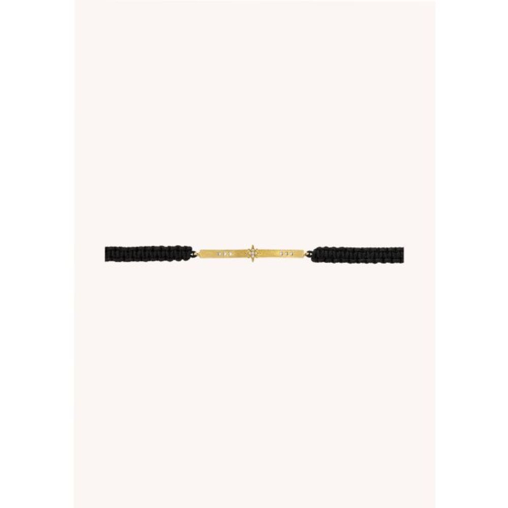 Monté sur un cordon noir tissé de fils dorés, il met en valeur un strass blanc éclatant en son centre, comme une lumière précieuse qui accroche le regard. À la croisée de…