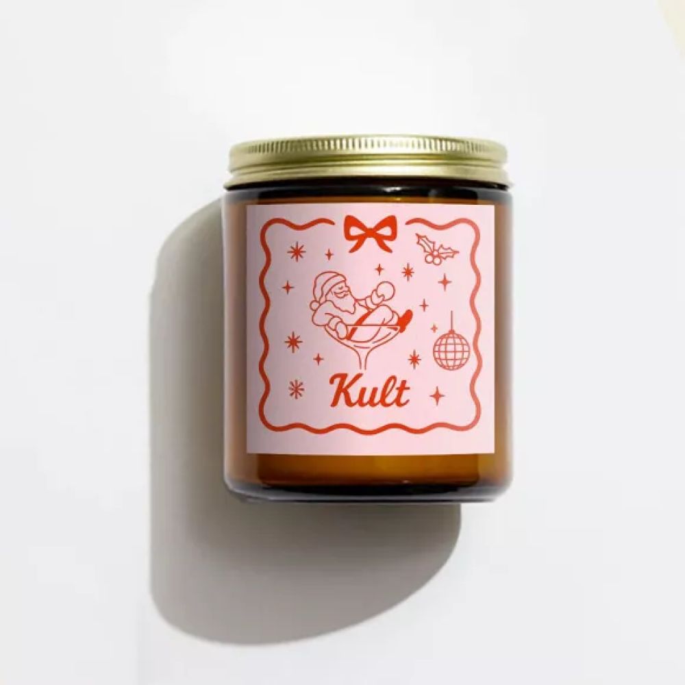 Bougie de Noël format 180 grammes dans son contenant en verre ambré.