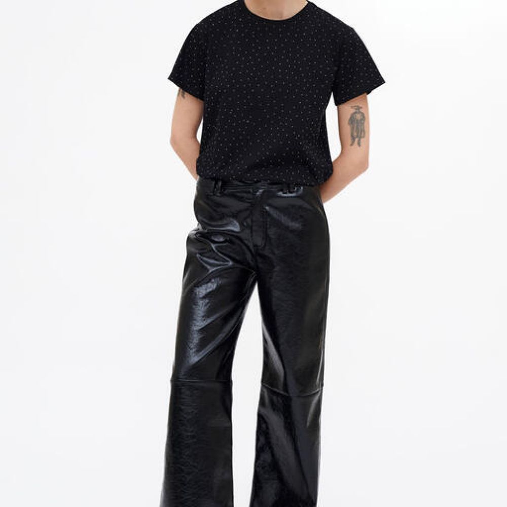 Pantalon noir à effet velours. Taille fixe mi-haute et jambes droites. Fermeture à glissière et bouton sur le devant.