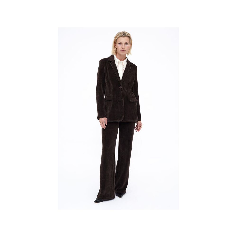 Blazer marron effet velours avec col à revers et manches longues. Fermeture à boutons sur le devant. Poches à rabat sur le devant.