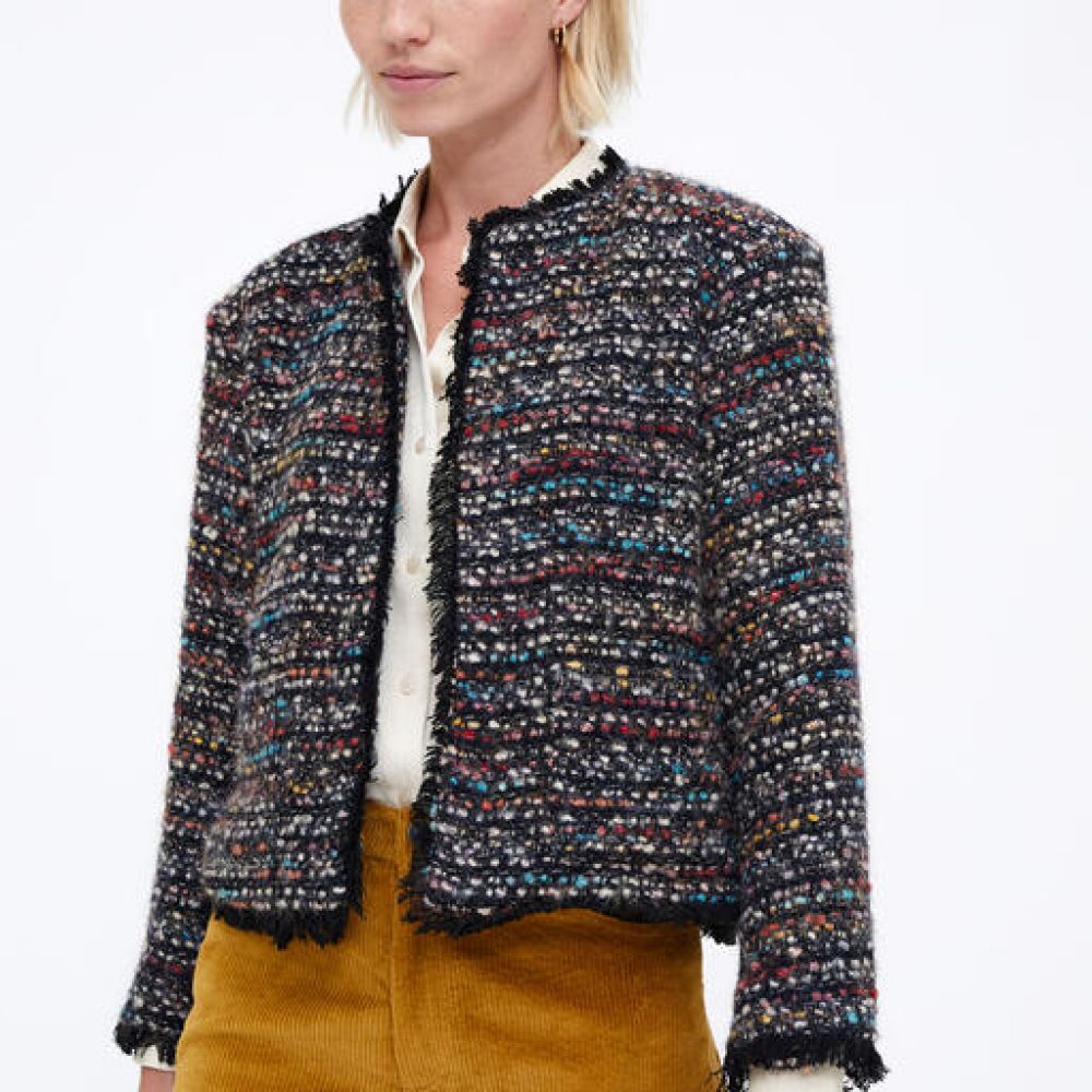 Veste en tweed multicolore. Col rond et manches longues. Fringes aux extrémités. Doublure intérieure.