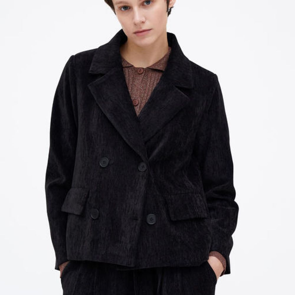 Blazer noir effet velours. Col claudine et manches longues. Fermeture boutonnée sur le devant. Poches à rabat sur le devant. Doublure intérieure.