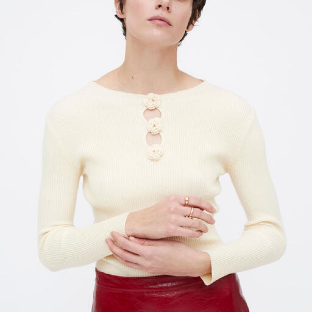 Top en maille côtelée blanche. Col rond, encolure en V avec roses brodées et manches longues.