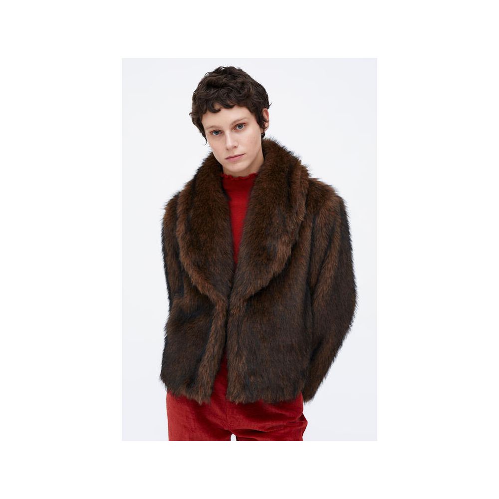 Manteau court effet fourrure couleur marron. Col à revers et manches longues. Fermeture à boutons sur le devant. Doublure intérieure.
