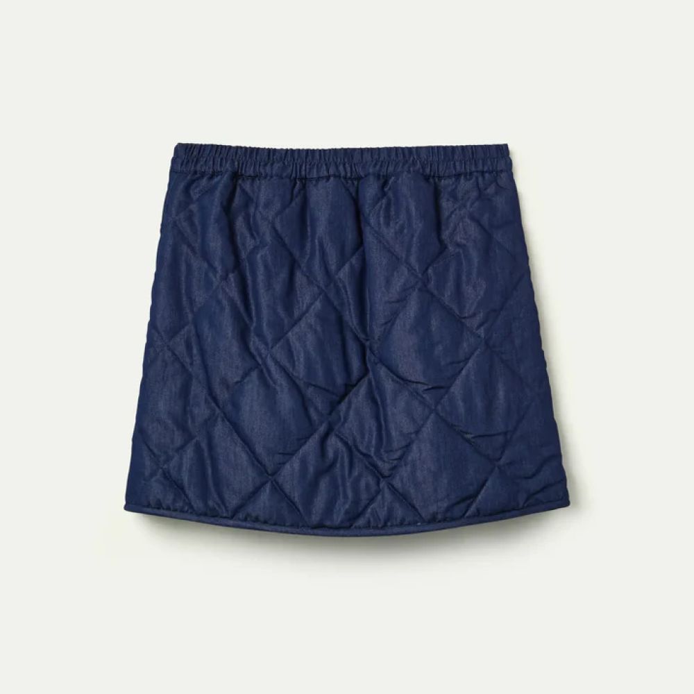 Jupe courte en tissu chambray matelassé 100 % coton bleu. Taille haute fixe. Le mannequin mesure 177 cm et porte la taille S.