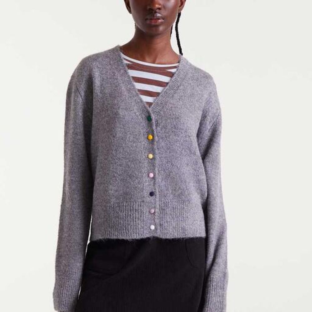 Cardigan en maille gris. Col en V et manches longues avec épaules légèrement tombantes. Fermeture sur le devant avec boutons multicolores. Finitions en bord-côte. Le mannequin mesure 178 cm et porte une taille S.