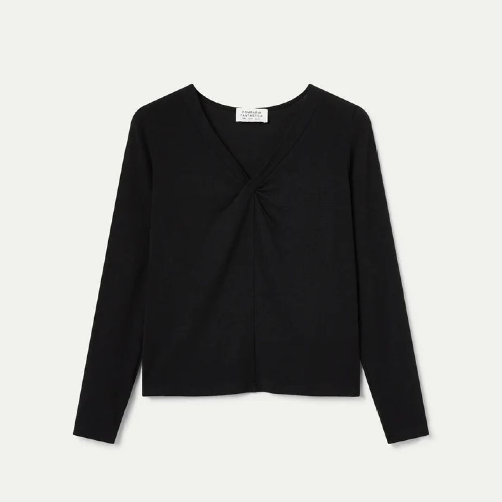 T-shirt noir. Col en V asymétrique noué. Manches longues. Le mannequin mesure 177 cm et porte une taille S.COMPOSITION : 81 % polyester, 14 % viscose, 5 % élasthanne | ENTRETIEN : lavage en machine à l’eau froide, ne pas utiliser d’eau de Javel, ne pas mettre au sèche-linge, sécher à l’ombre, repasser à une…