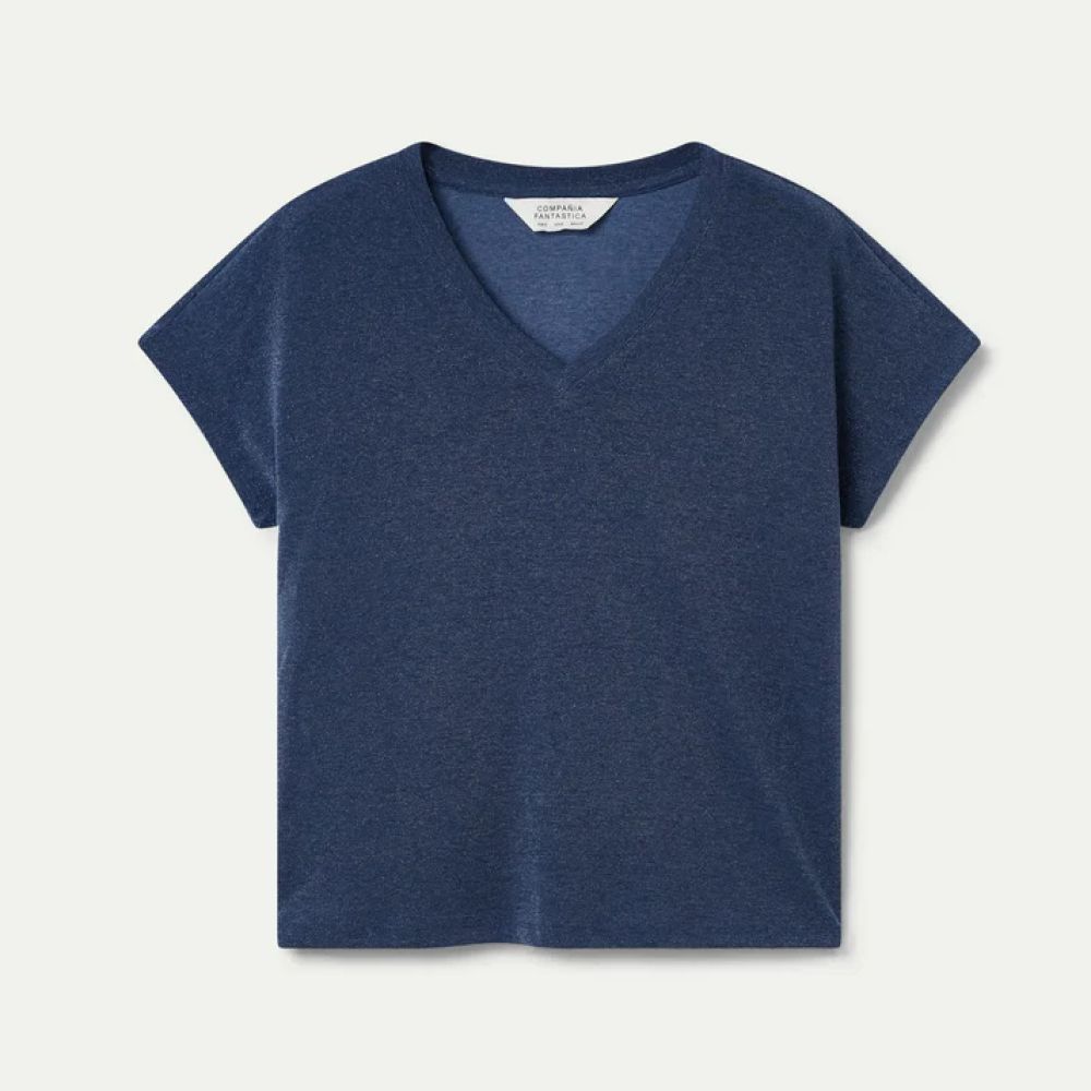 T-shirt en jersey lurex bleu marine. Col en V et manches courtes. Le mannequin mesure 177 cm et porte une taille S.