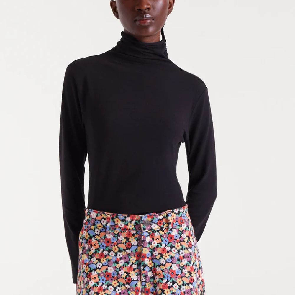 T-shirt noir. Col montant et manches longues. Le mannequin mesure 179 cm et porte la taille S.rnrnCOMPOSITION : 81 % polyester, 14 % viscose, 5 % élasthanne | ENTRETIEN : lavage en machine à l’eau froide, ne pas utiliser d’eau de Javel, ne pas mettre au sèche-linge, sécher à l’ombre, repasser à une température maximale…