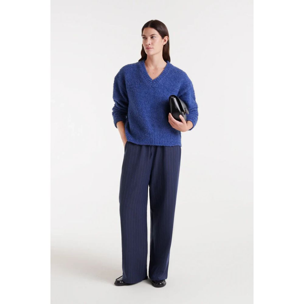 Pantalon à rayures diplomatiques bleu. Taille moyenne et élastique à l’arrière. Jambe droite et fermeture par cordon fin. Le mannequin mesure 177 cm et porte la taille S.