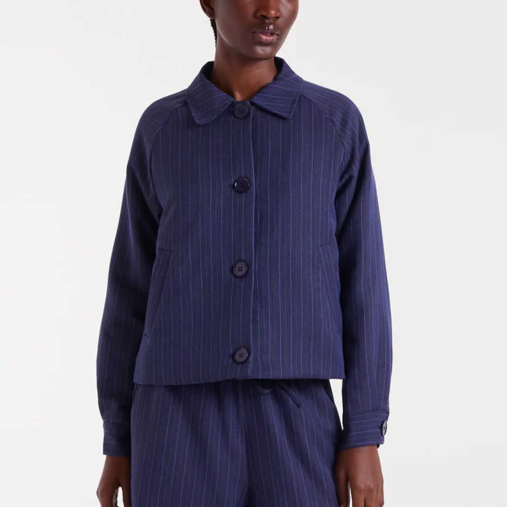 Veste à rayures diplomatiques bleues. Col à revers avec manches longues à poignets boutonnés. Fermeture à boutons sur le devant. Épaules légèrement tombantes. Le mannequin mesure 178 cm et porte une taille S. Taille moyenne et élastique à l’arrière. Jambe droite et fermeture par cordon fin. Le mannequin mesure 177 cm et porte la taille…