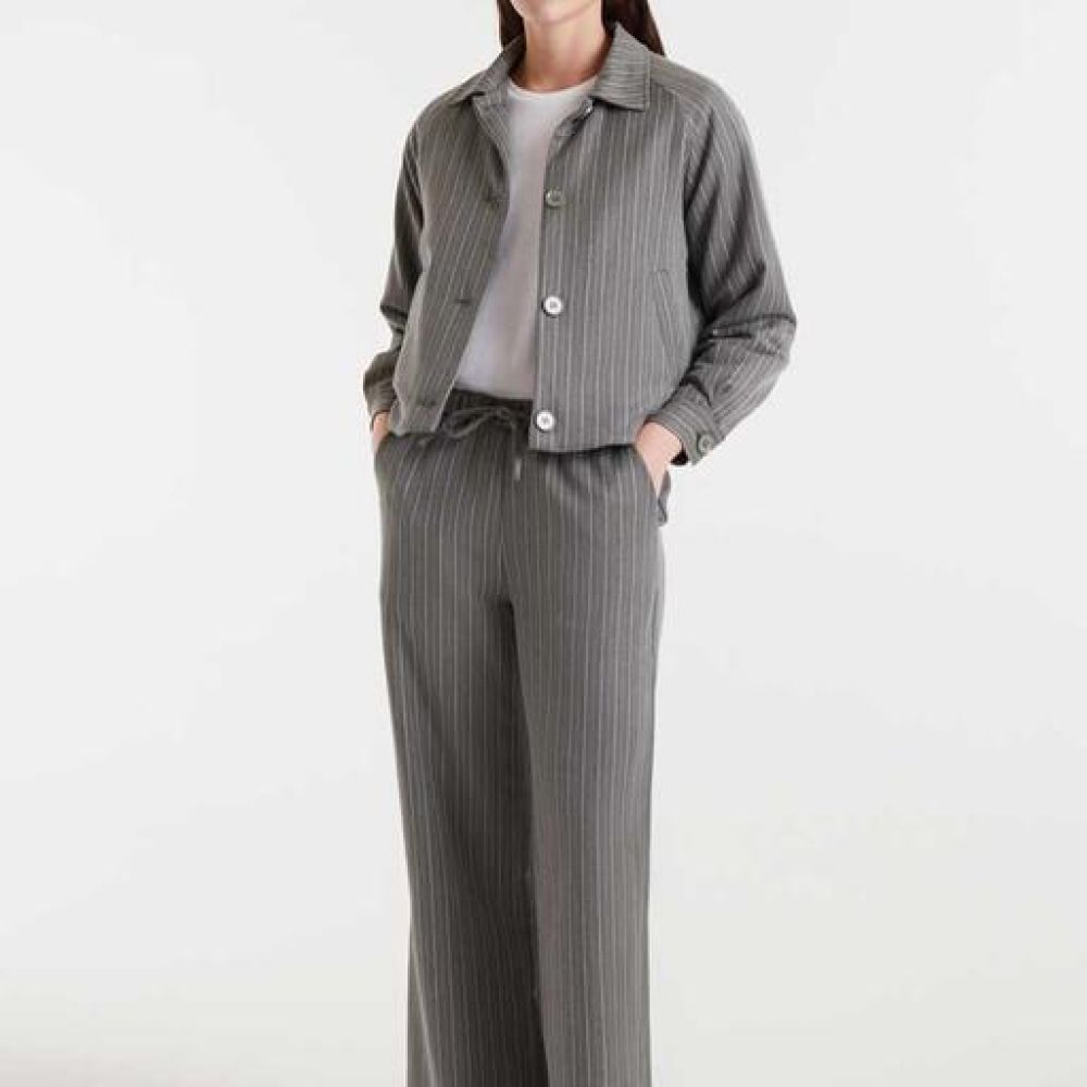 Veste à rayures diplomatiques grise. Col à revers avec manches longues à poignets boutonnés. Fermeture à boutons sur le devant. Épaules légèrement tombantes. Le mannequin mesure 178 cm et porte une taille S. Taille moyenne et élastique à l’arrière. Jambe droite et fermeture par cordon fin. Le mannequin mesure 177 cm et porte la taille…