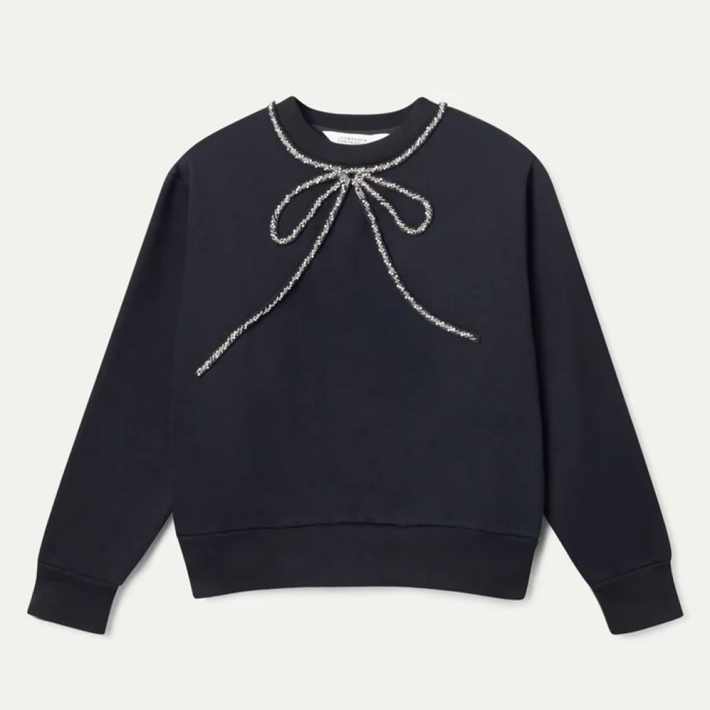 Sweat-shirt en molleton noir. Col rond et manches longues. Nœud orné de strass au niveau du col. Finitions en rib. Le mannequin mesure 179 cm et porte une taille S.