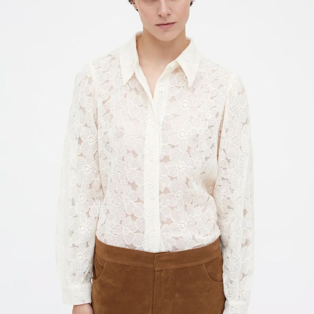 Chemise blanche avec dentelle florale. Col à revers et manches longues avec poignets boutonnés. Fermeture à boutons sur le devant.