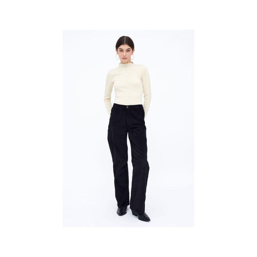 Pantalon droit en velours côtelé noir. Taille fixe mi-haute et jambes droites. Fermeture à glissière et bouton sur le devant. Poches latérales.