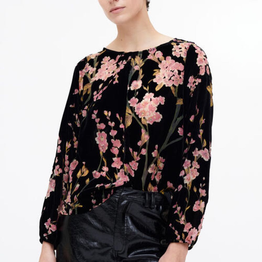 Top en velours imprimé Malva Velvet. Col rond et manches longues avec détails froncés aux poignets.