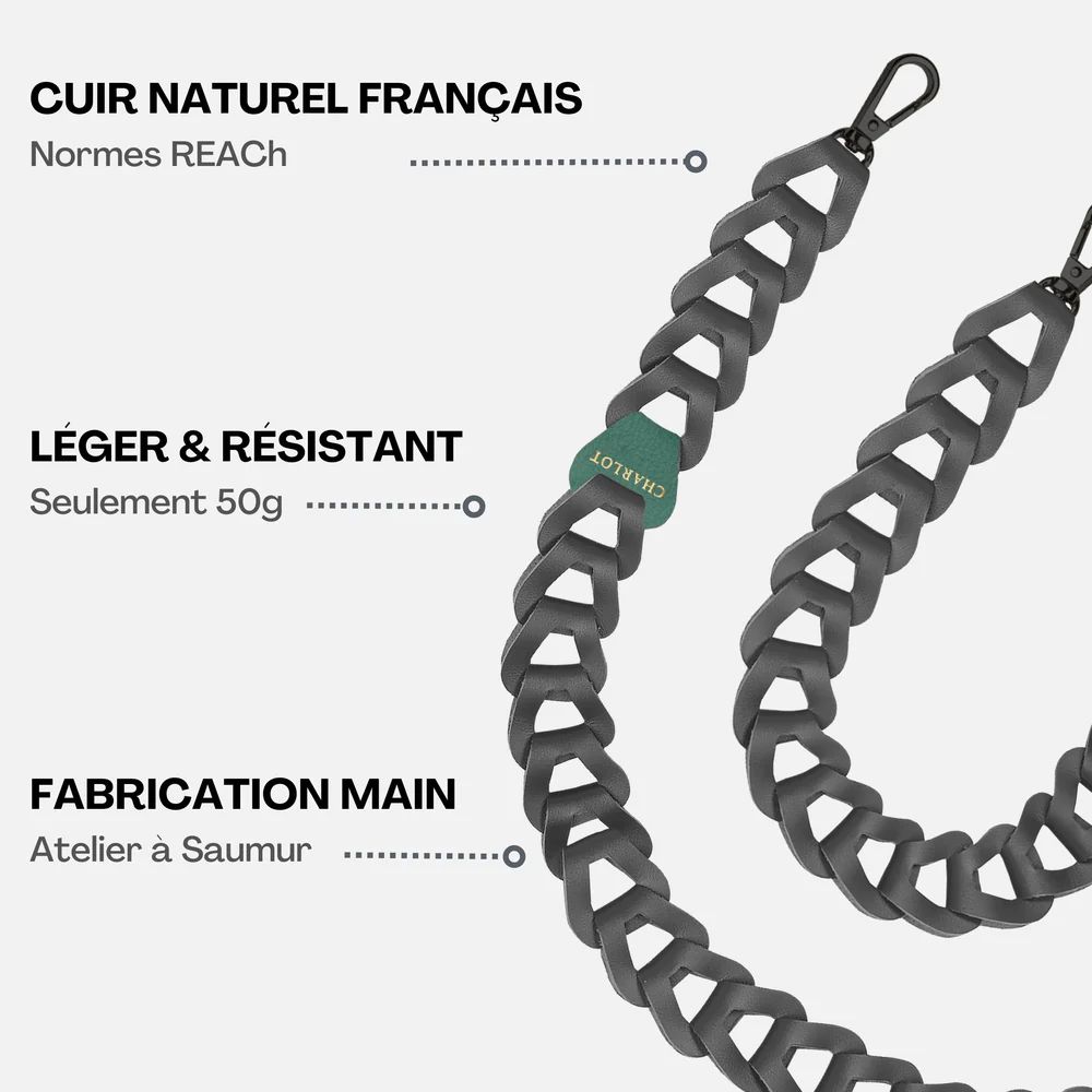 Bandoulière MEL Cuir composée de pièces de cuir entrelacées entièrement réalisée à la main dans notre atelier partenaire d’artisans maroquiniers à Saumur en France.rnrnNos cuirs sont sélectionnés dans le respect des normes les plus strictes REACh©️rnrnLivrée dans un pochon en coton écologique réutilisable.rnrnPermets de porter son téléphone sur soi en bandoulière pour toujours garder les mains libres. Compatible avec votre coque CHARLOT et notre adaptateur universel. Peut-être utilisée en anse de sac à main.rnrnTrès agréable à porter au quotidien, notre bandoulière est légère (ne pèse que 50 grammes en version longue) mais très résistante..rnrnDécliné en plusieurs coloris et formats (version longue 120cm et courte 30cm), conçu pour s’adapter à tous les styles.
