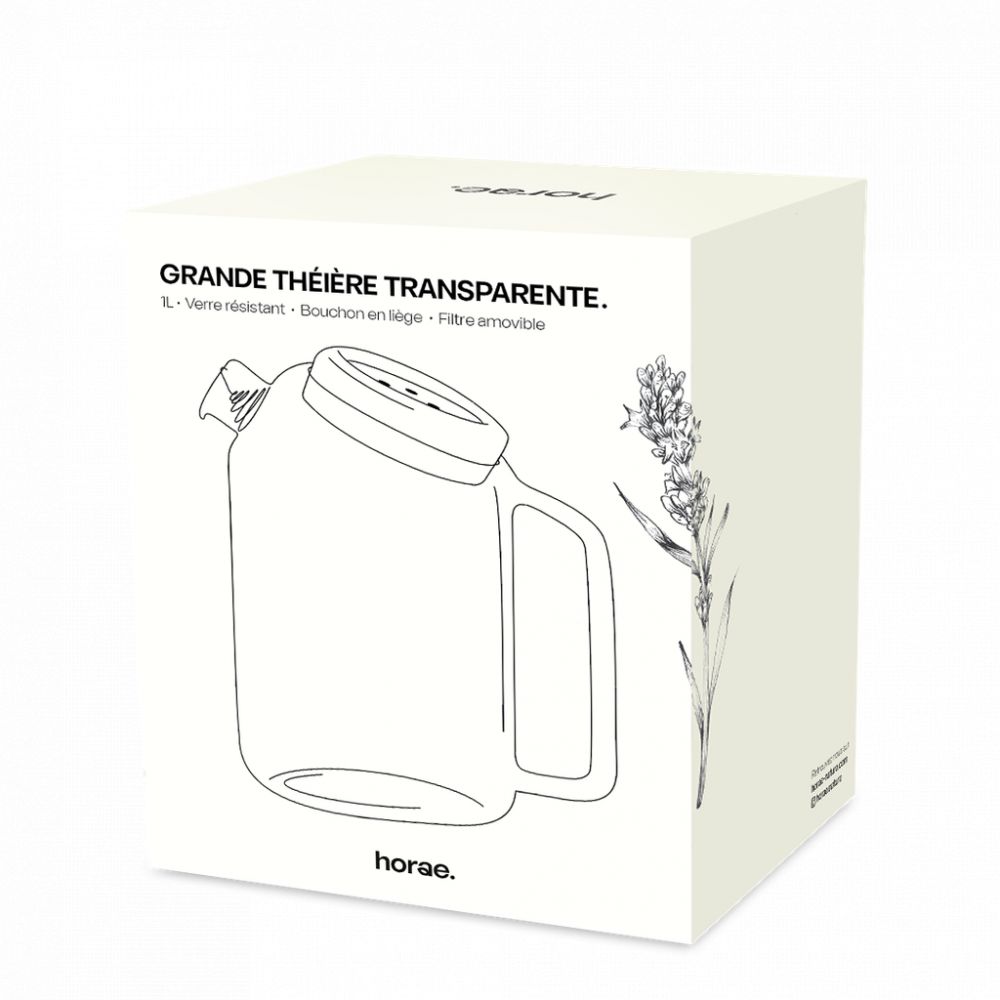 Cette jolie théière transparente est soufflée en verre borosilicate pouvant résister à de très forte chaleur.rnrnSa coupe en biais est parfaite pour infuser les bouquets Horae.rnrnSon filtre en inox facile à retirer pour être lavé retient toutes les matières organiques de nos infusions vrac.rnrnElle est équipée d’un bouchon en liège pouvant également être placée dessous pour protéger la table de la chaleur.rnrnL’accessoire indispensable pour profiter pleinement de l’expérience unique qu’offrent les infusions de fleurs et les plantes Horae.rnrnExiste en 700mL et en 1L.rnrnDu verre soufflé en borosilicate ultra résistant aux fortes températures.rnUne coupe unique, idéale pour l’infusion des bouquets et des formats vrac.rnUn filtre en inox et un bouchon en liège.rn