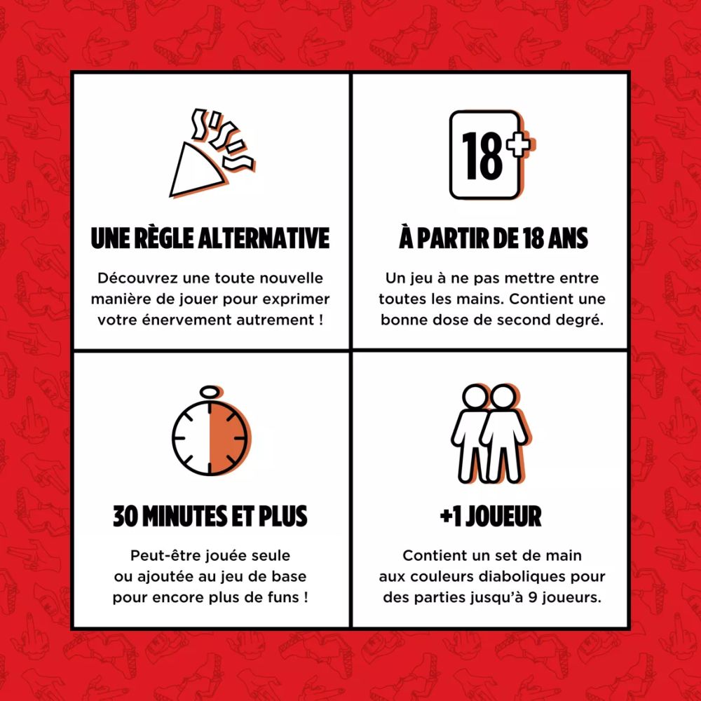 Découvrez également une toute nouvelle manière de jouer ainsi qu’un set de mains aux couleurs diabolique ! Ajoutez-le au jeu de base pour jouer jusqu’à 9 joueurs.