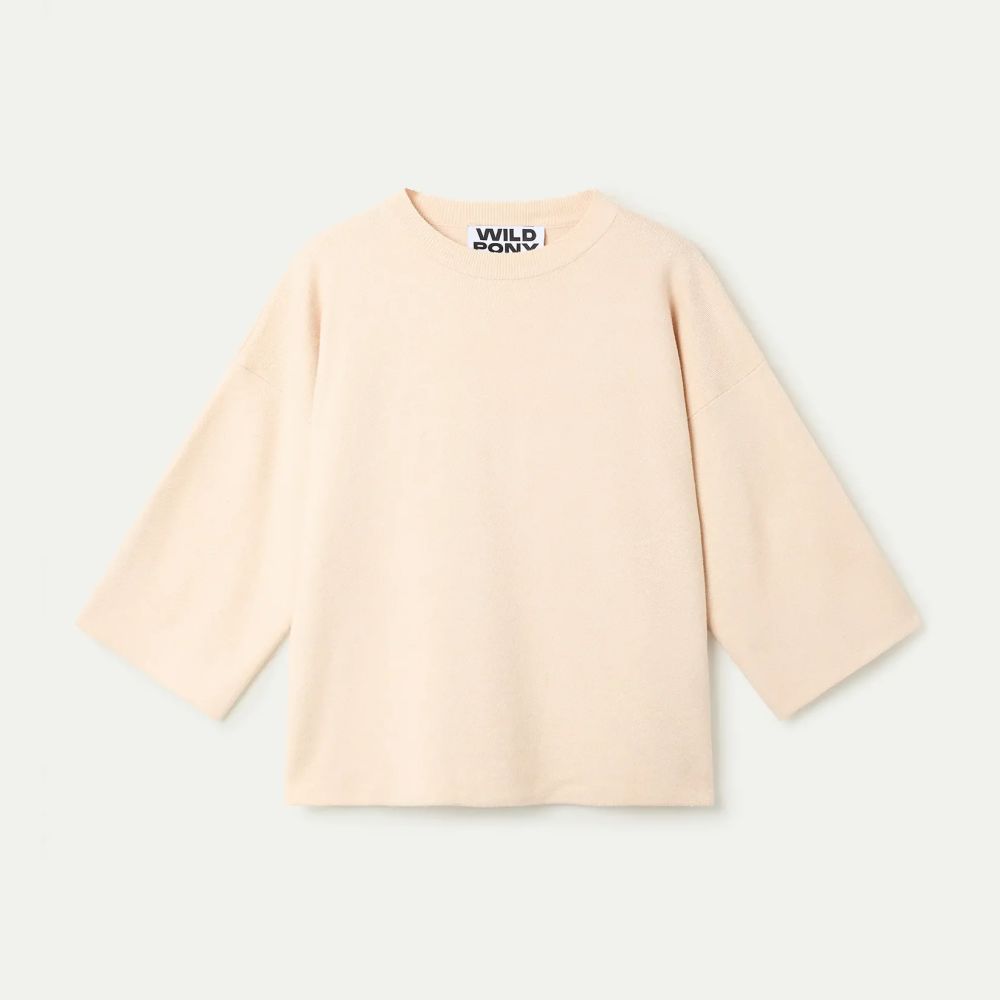 Pull blanc à manches longues en maille fine, col rond et manches françaises larges à épaules tombantes.