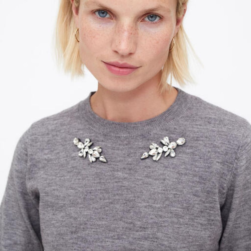 Pull en maille gris avec bijou appliqué. Col rond et manches longues avec détails en bord-côte.