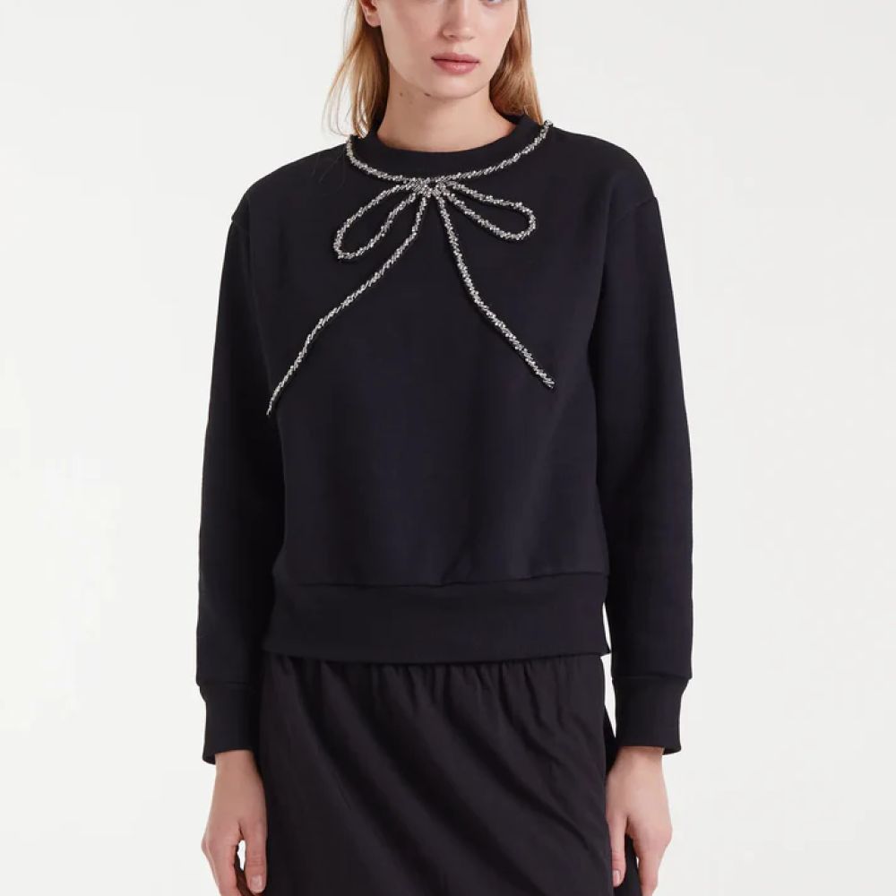 Sweat-shirt en molleton noir. Col rond et manches longues. Nœud orné de strass au niveau du col. Finitions en rib. Le mannequin mesure 179 cm et porte une taille S.