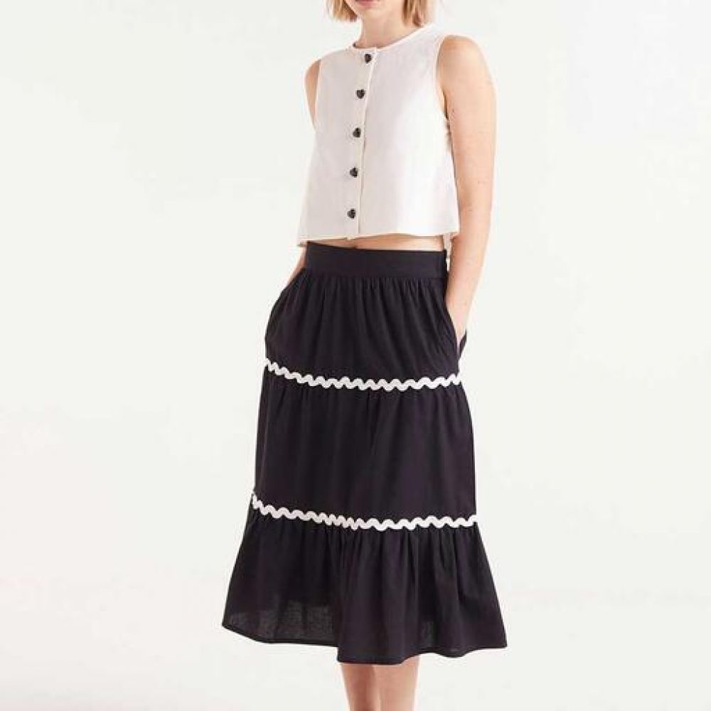 Robe chemise midi en crêpe léger avec imprimé de cœurs noirs et blancs. Col à revers et manches courtes bouffantes. Fermeture sur le devant par boutons et ceinture.