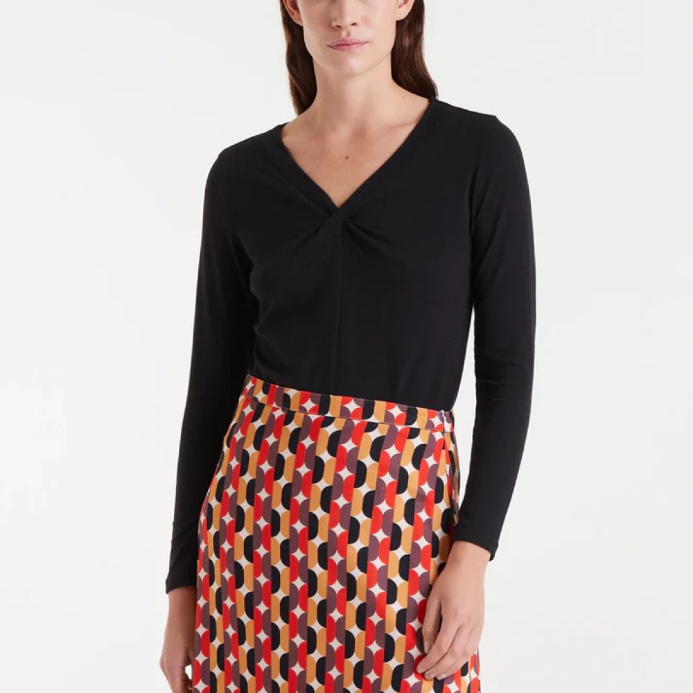 T-shirt noir. Col en V asymétrique noué. Manches longues. Le mannequin mesure 177 cm et porte une taille S.COMPOSITION : 81 % polyester, 14 % viscose, 5 % élasthanne | ENTRETIEN : lavage en machine à l’eau froide, ne pas utiliser d’eau de Javel, ne pas mettre au sèche-linge, sécher à l’ombre, repasser à une température maximale de 110 °C, laver avec des couleurs similaires