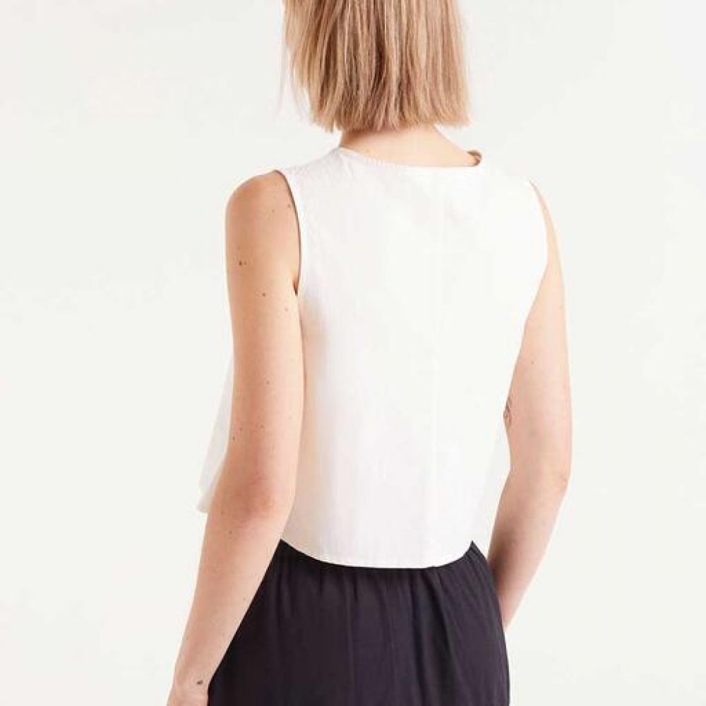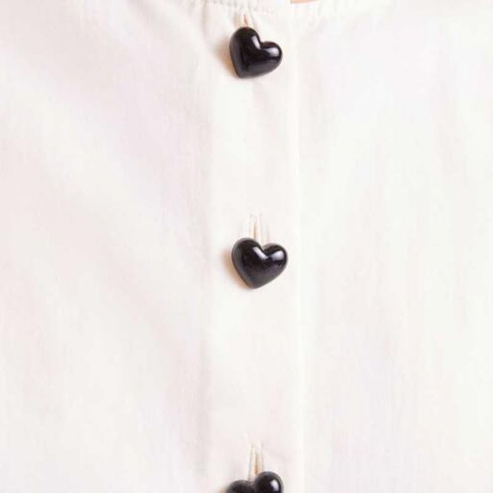 Top court en popeline de coton blanche. Col rond et sans manches. Fermeture sur le devant par des boutons décoratifs en forme de coeur noir.