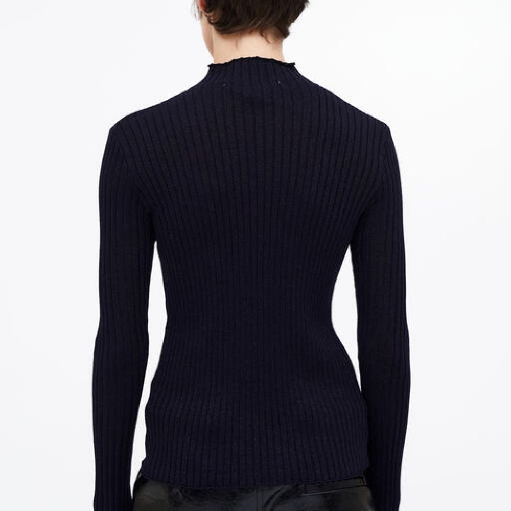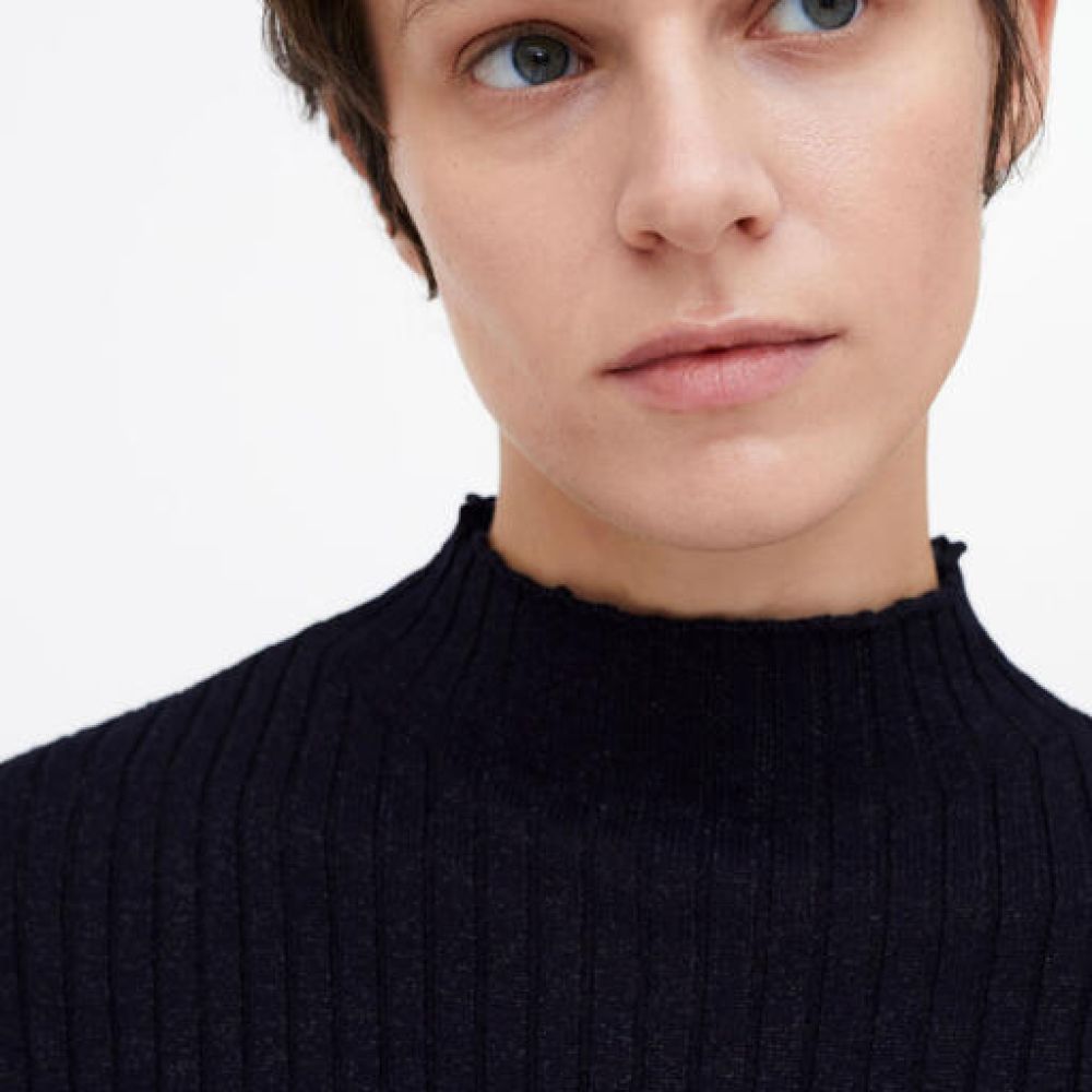 Top en maille côtelée à col Perkins, couleur bleu marine. Avec col Perkins, manches longues et détails en lurex côtelé.