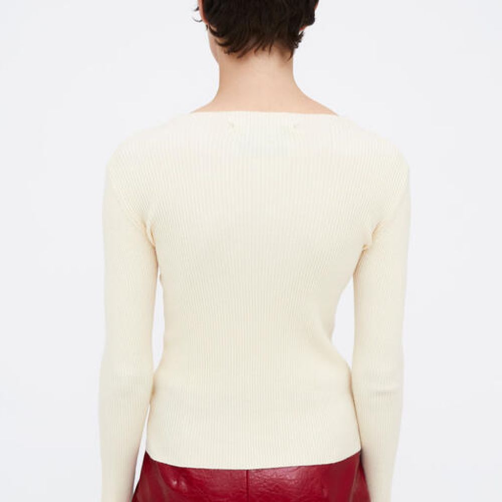 gilet beige en maille fine à coupe évasée. Col rond et manches longues. Bordures côtelées.